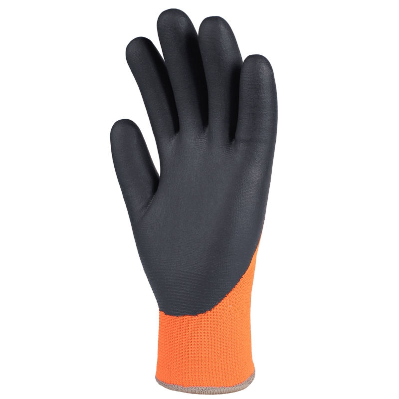 Black Foam nitrile coated on fluorescene orange seamless knitted double layer shell: Inner shell 7 gauge knitted thermal and out shell 13 gauge knitted. 3/4 coated back.