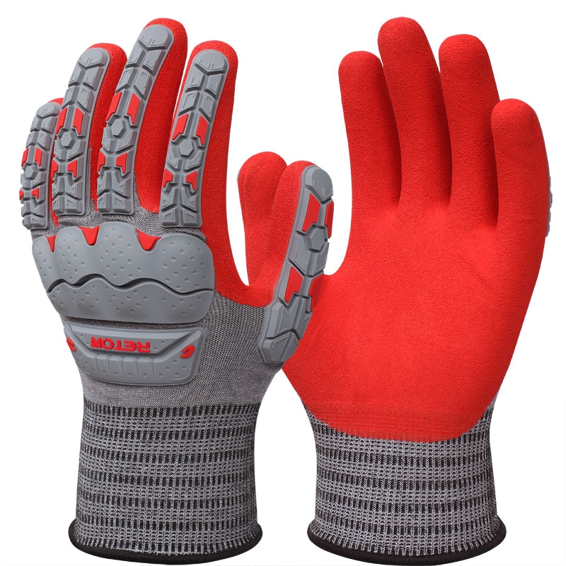 13Guage A5 seamless knitted high performance polyethylene(HPPE) with steel glove shell,sandy finished latex palm dipped,impact TPR on back and fingers.