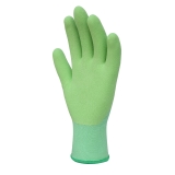 13 gauge green nylon seamless knitted glove shell with green sandy finished latex coating on palm. Breathable back.