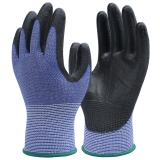 Shell 13 gauge blue seamless knitted HPPE/fiber glass with black Polyurethane smooth coating palm.Breathable back.